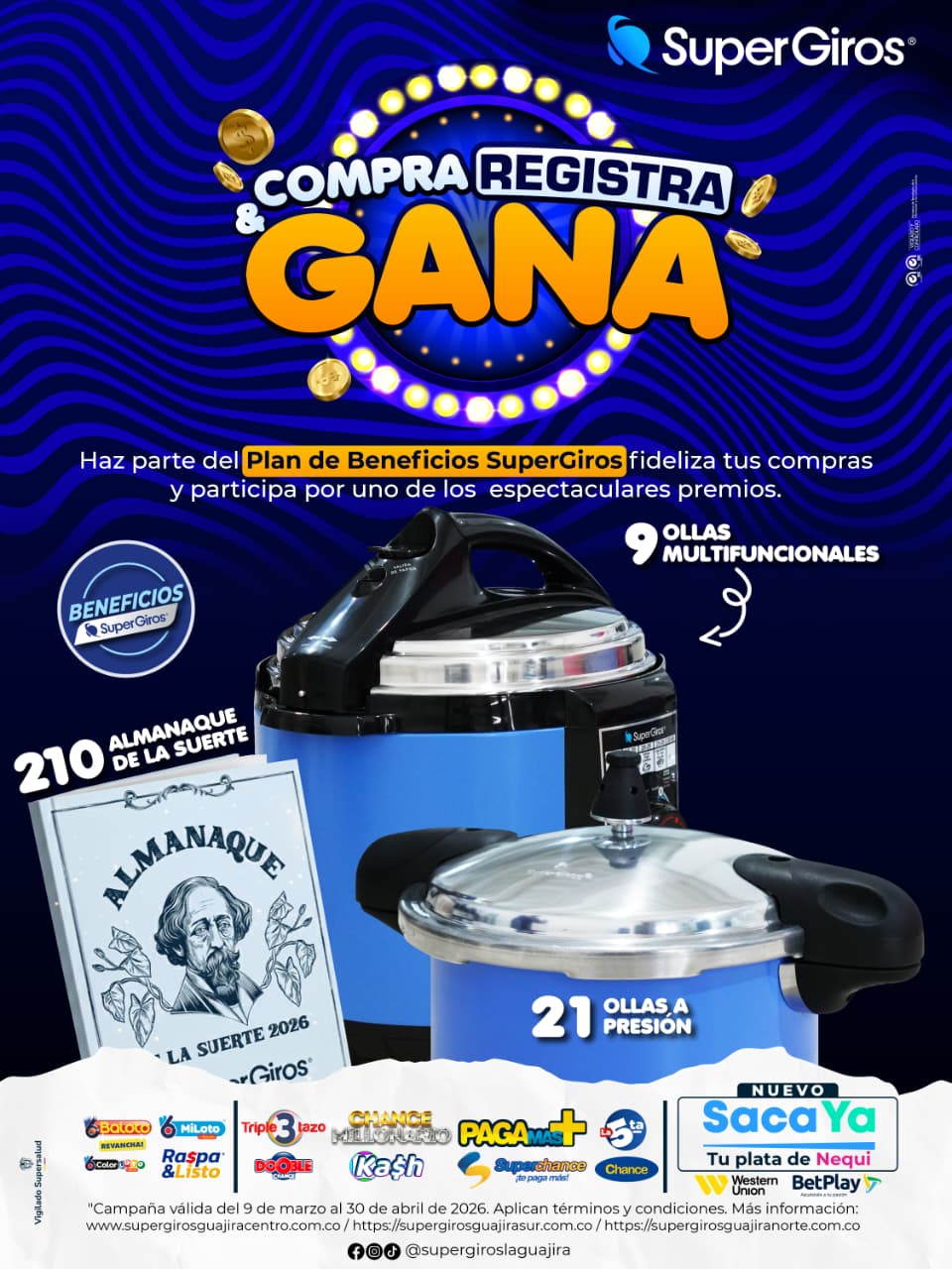 PROCESO DE PARTICIPACIÓN Y CONDICIONES: Del nueve  (9) marzo al   treinta (30) de abril  del 2026, para participar los clientes deberán cumplir con las siguientes condiciones: Podrán participar en el promocional “COMPRA REGISTRA Y GANA”  todo cliente que haga parte al plan de beneficio de SuperGiros® y SER RED S.A que fidelicen sus compras   durante la vigencia del promocional.  Entran a participar todo el portafolio de productos y servicios (chance, La Ñapa, SuperChance, Tripletazo, PagaMas, La Quinta, Chance Millonario, Super Astro, Raspa&Listo, kash, Recargas a BetPlay, Baloto, MiLoto, ColorLOTO, Giros nacionales, Giros locales, Giros internacionales, recargas móviles, adquiridos en los puntos SuperGiros®